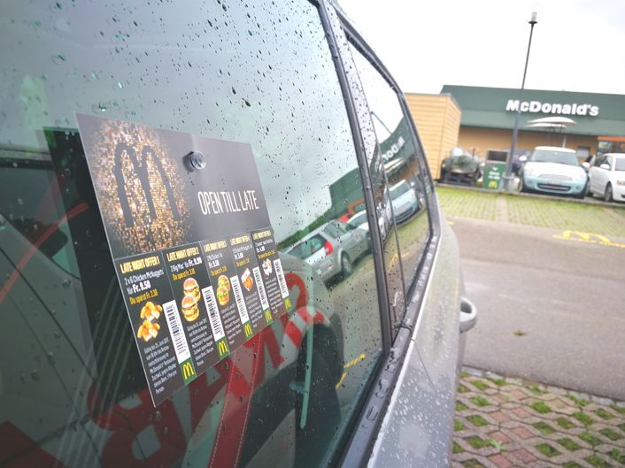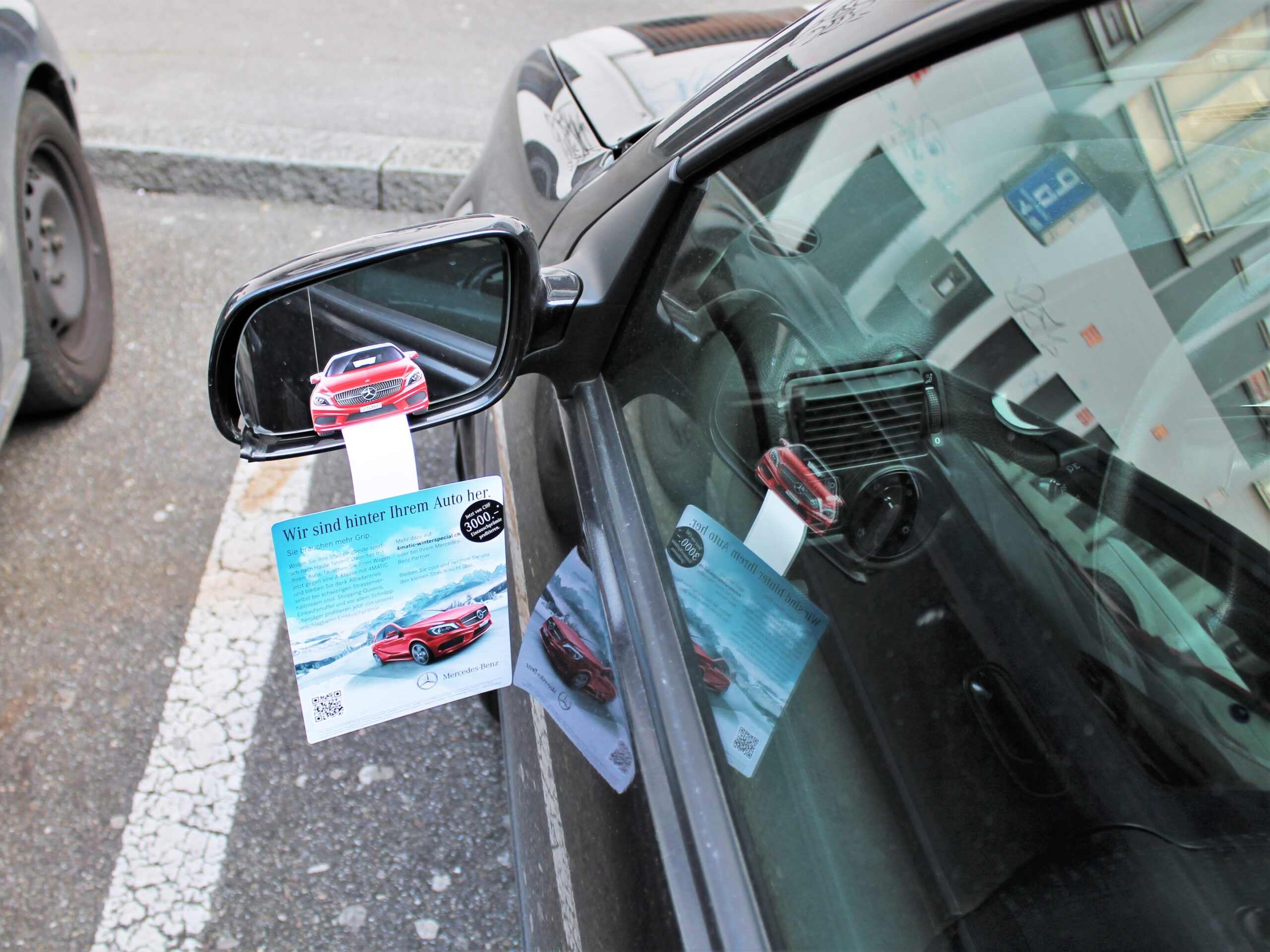 Kleine Karte, grosse Wirkung: Mit Saugnäpfen bringen wir die sogenannten Octopus Cards im A6-Format bei Autoscheiben an. Damit ist Ihnen die Aufmerksamkeit sowohl der Fahrer:innen sowie Passant:innen sicher.