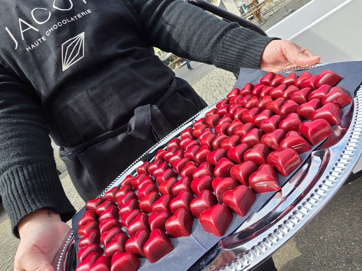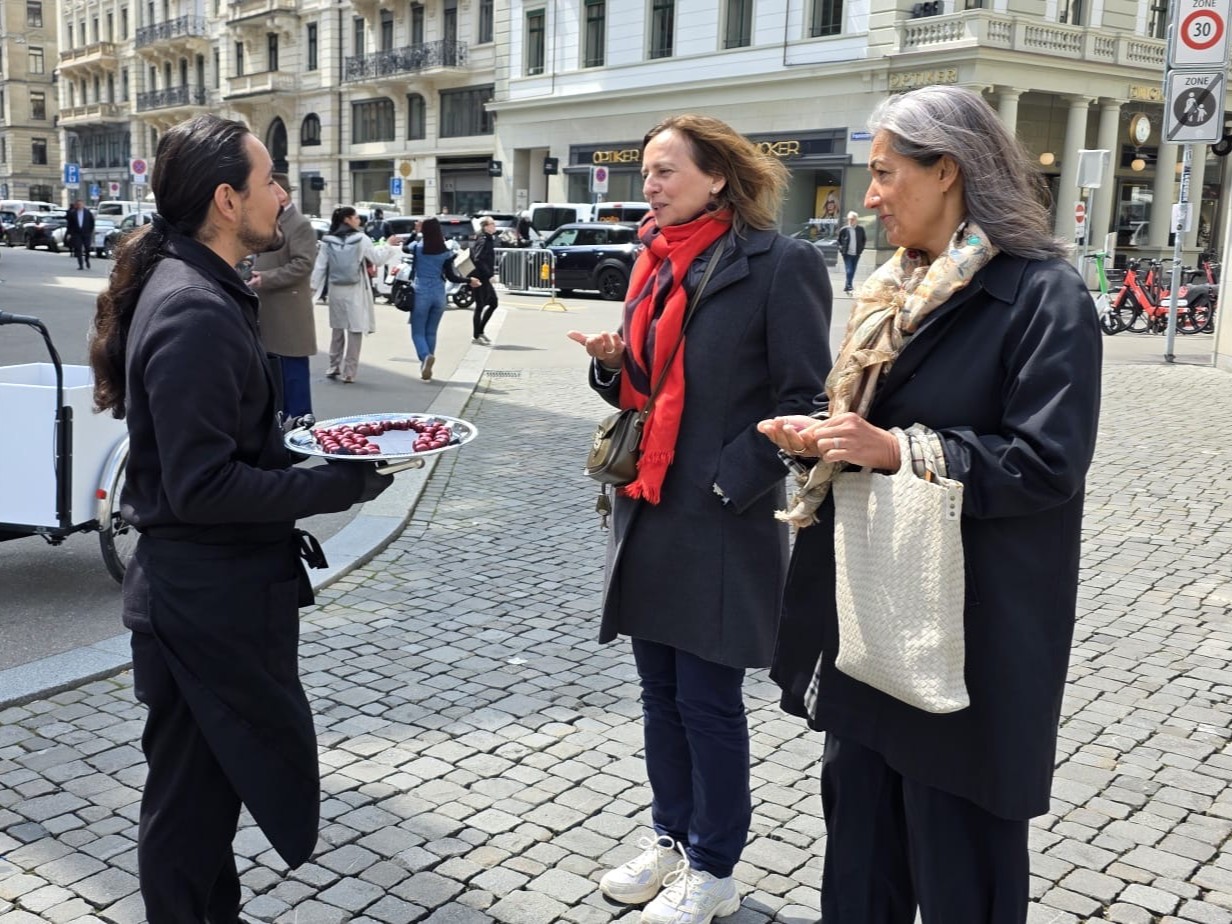 Das Geld liegt auch in Zürich nicht auf der Strasse. Doch manchmal wird einem dort unverhofft ein Fünf-Sterne-Praliné gereicht. So erging es zumindest den Passant:innen während unserer Promotion für die Chocolatierie Jacot am Münsterhof.
