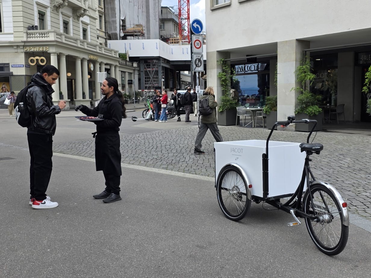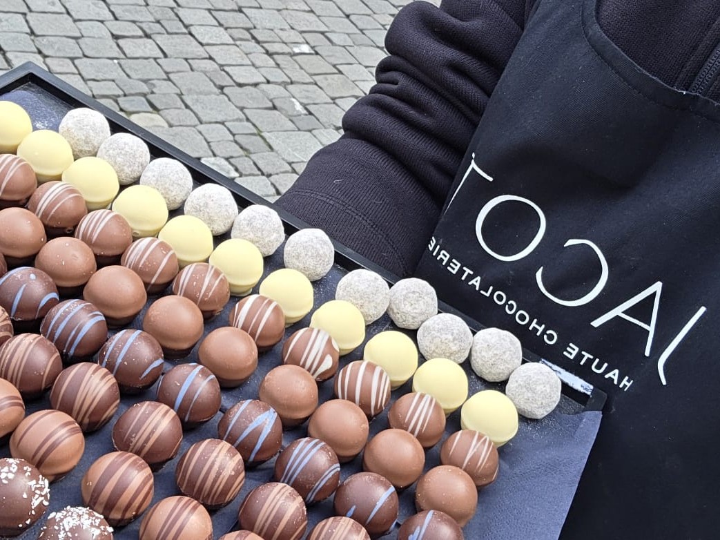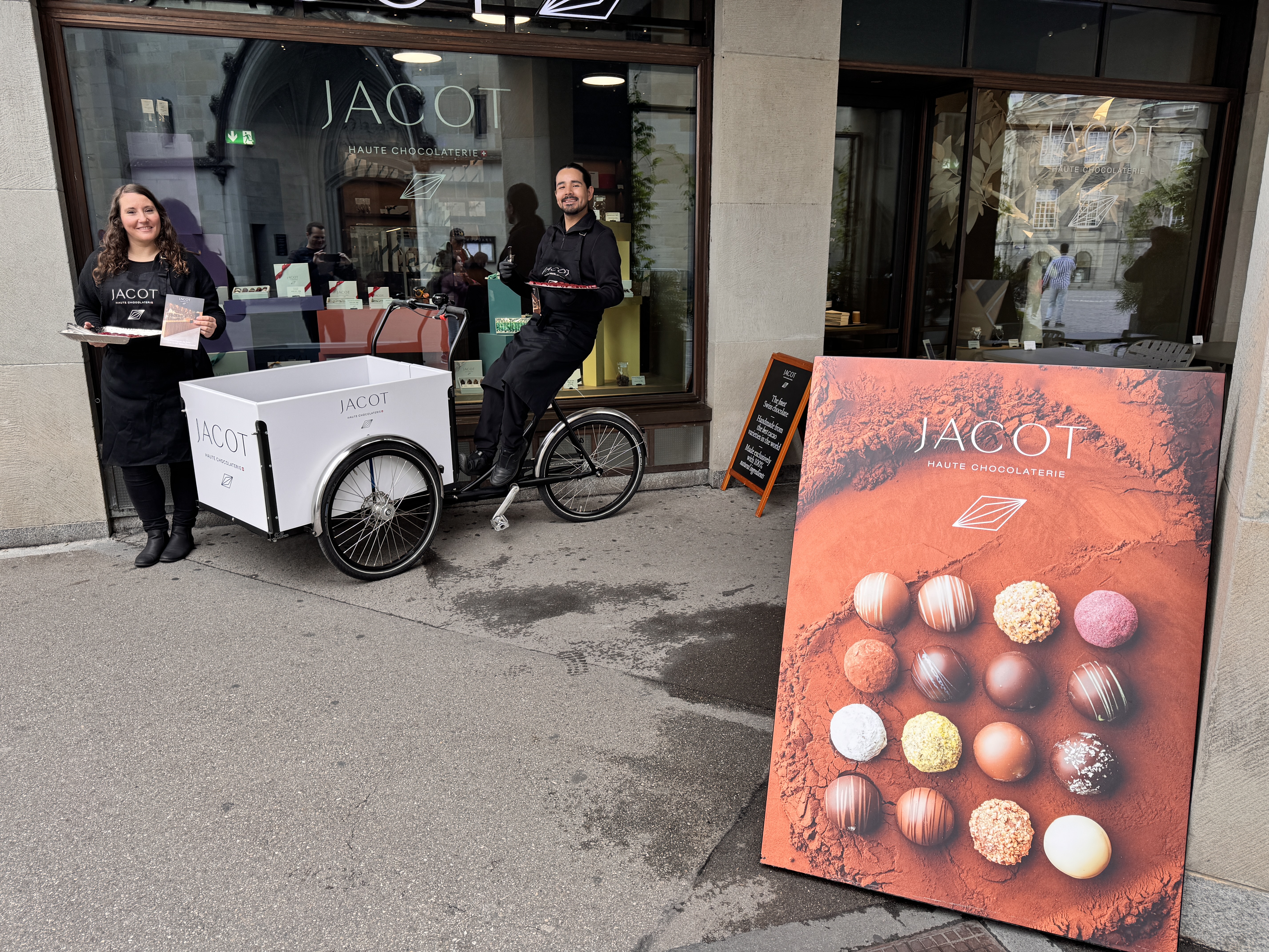Am Zürcher Münsterhof befindet sich das einzige Geschäft auf deutschsprachigem Gebiet. Doch eigentlich reichte für unser Promoter:innen-Team ein Lächeln, ein Serviertablett und 1’500 Pralinés, damit die Menschen verstanden: Hier gibt es eine süsse Überraschung für umsonst – und wer auf den Geschmack gekommen war, musste nur ein paar Schritte weiter für einen Besuch bei der Chocolaterie Jacot.
